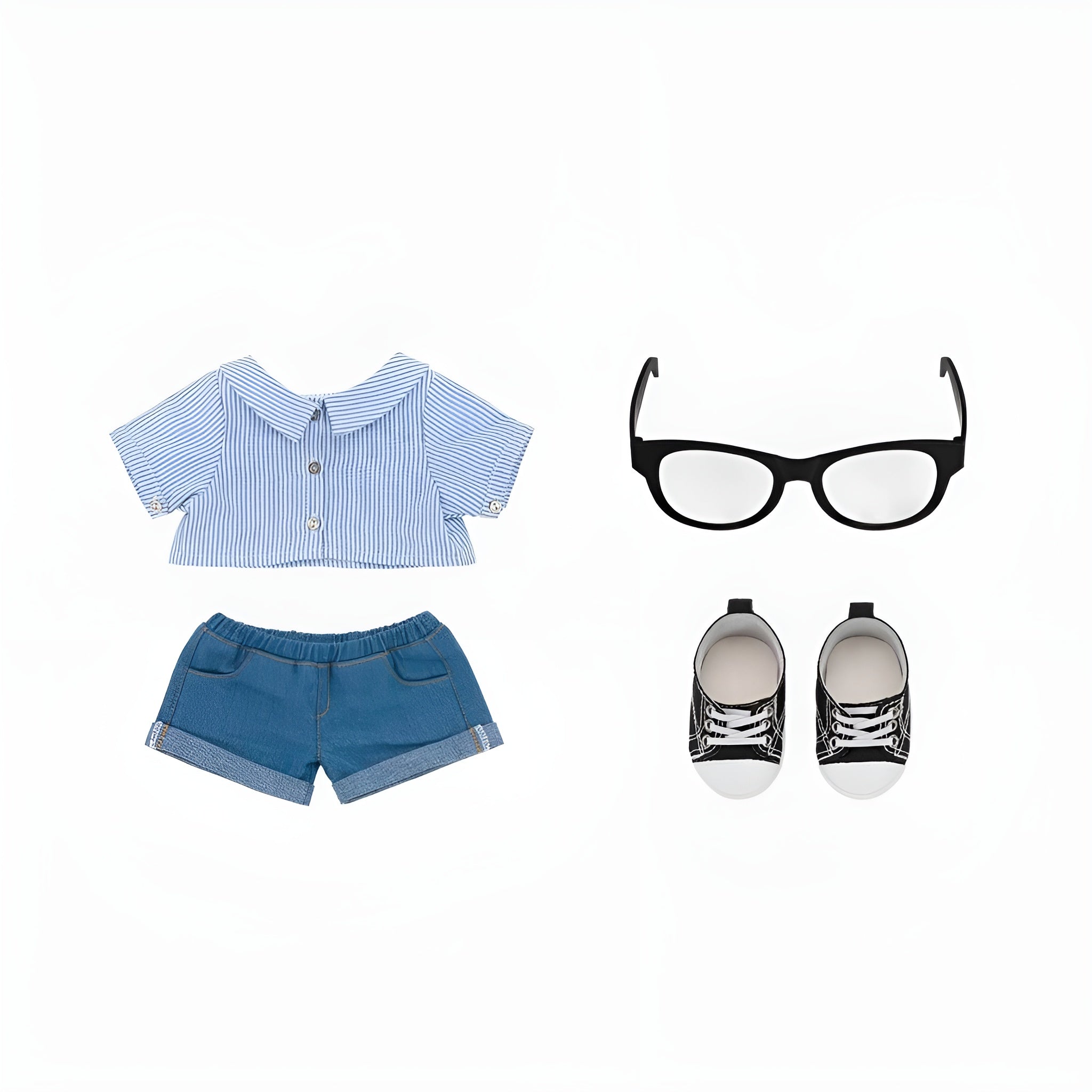 Design : visage en vinyle détaillé, fourrure plush, tenue décontractée stylée (chemise, jean, baskets)